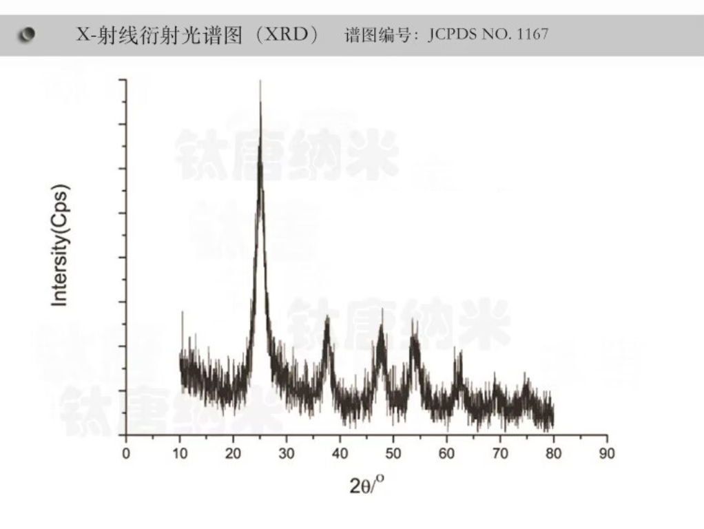 光触媒原料是锐钛矿型纳米二氧化钛,要确定产品是否属于该晶型,方法是做XRD测定。将一定量的光触媒液体产品中的水蒸发,105度烘干粉体。将所得到的粉体样品送相关检测中心的XRD检测室。图4是二氧化钛锐钛矿型晶体标准谱图。