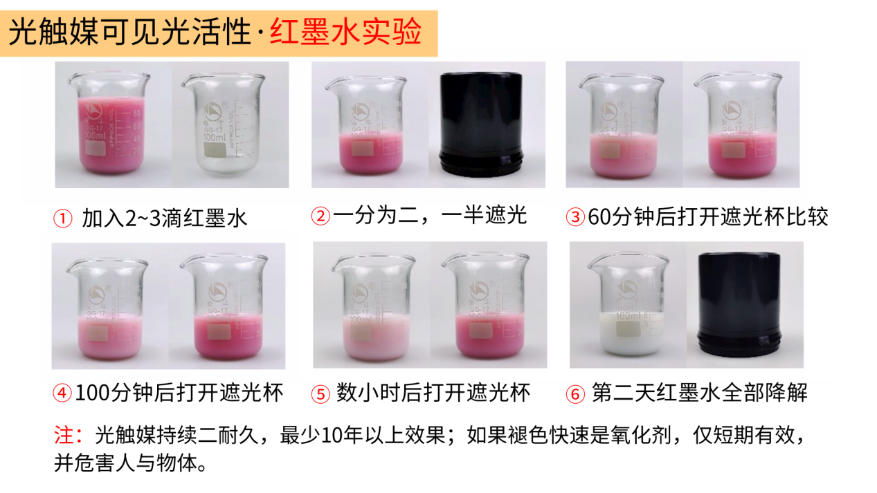 (2)如果加入红墨水马上褪色,或褪色数小时或隔天后又恢复颜色,则该产品可能是强氧化剂溶液,而非光触媒产品。置于暗处的另一半也发生褪色也说明是氧化剂或者加入了氧化剂。
