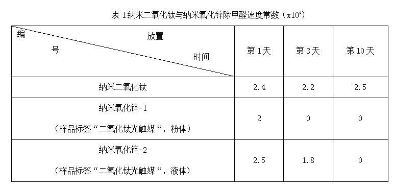 结论:二个纳米氧化锌样品分别在3天与10天后失去光催化功能,纳米二氧化钛光催化活性基本没有变化。