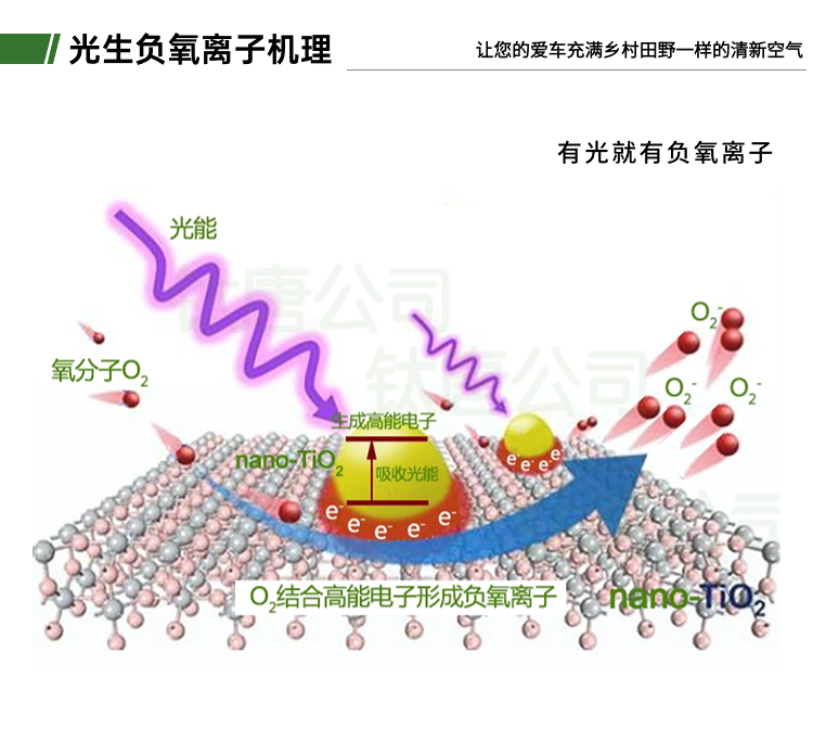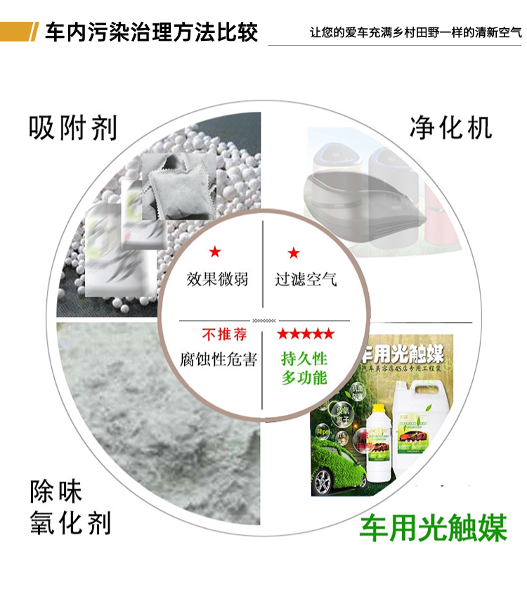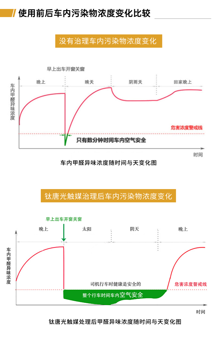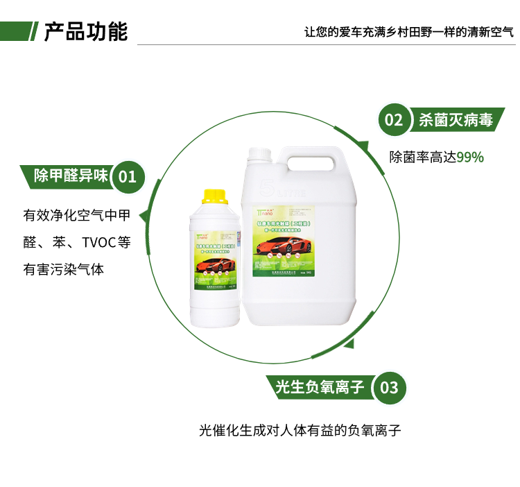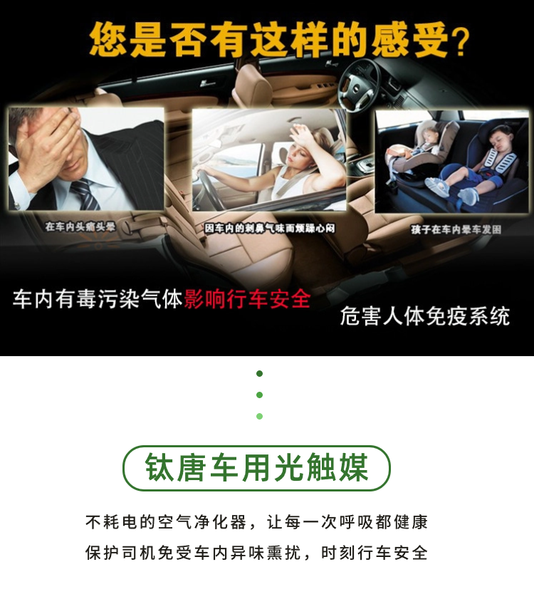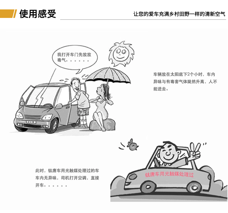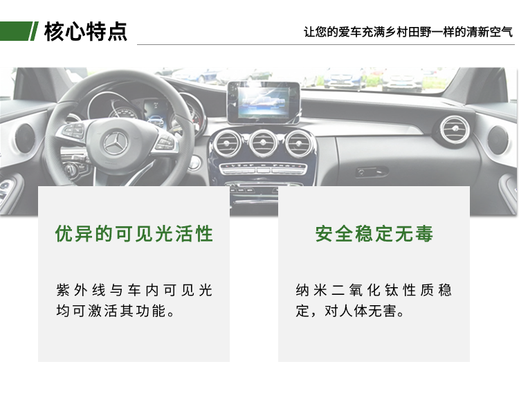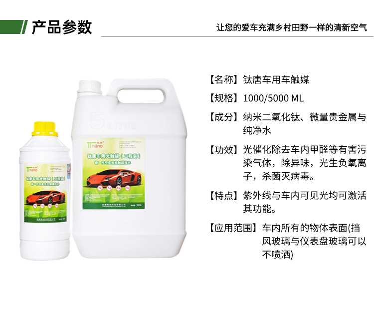 钛唐车用光触媒具有优异的车内光活性,高效持久除车内异味与甲醛;释放负氧离子,让您在行车时也能享受乡间田野一样的清新空气,有利行车安全;杀灭病菌,预防致病细菌传染。另外,光触媒形成的纳米膜吸收紫外线,因此对车内皮革与饰物具有一定的保护作用。