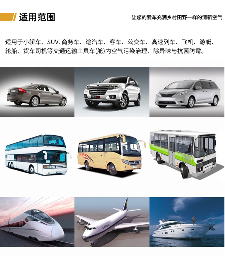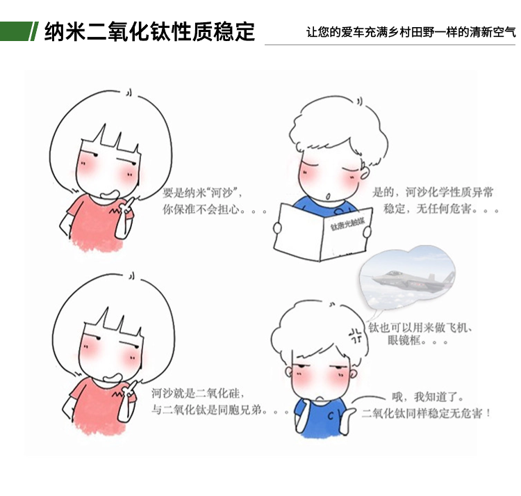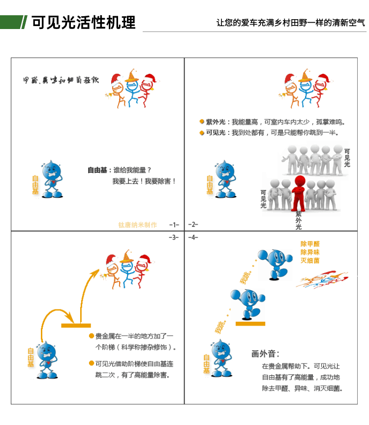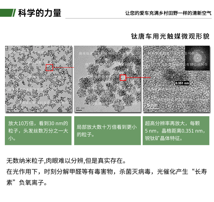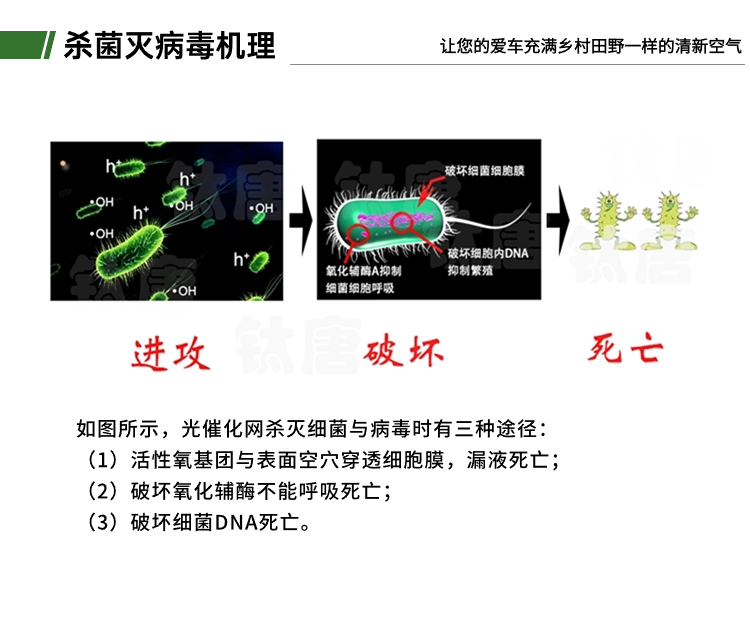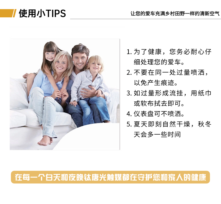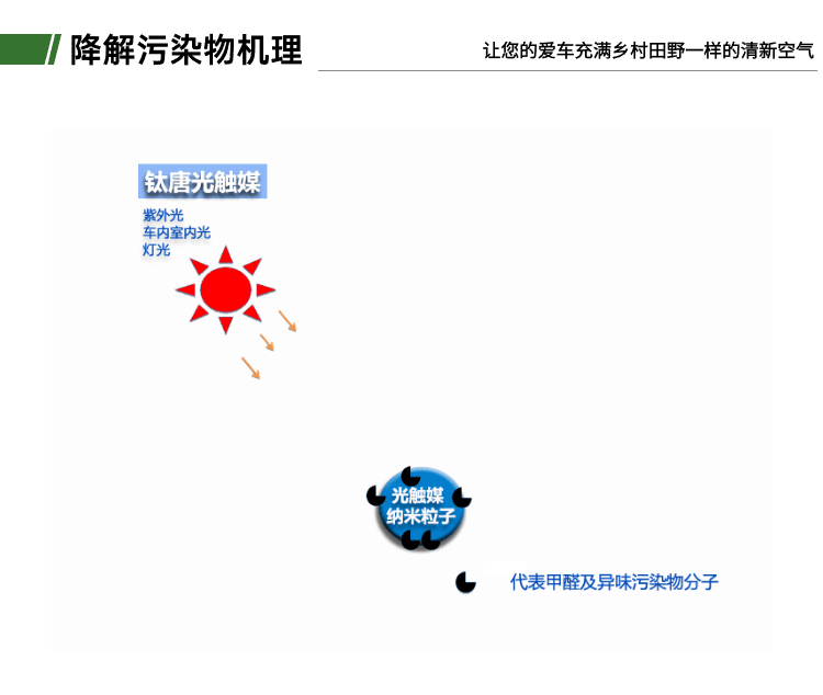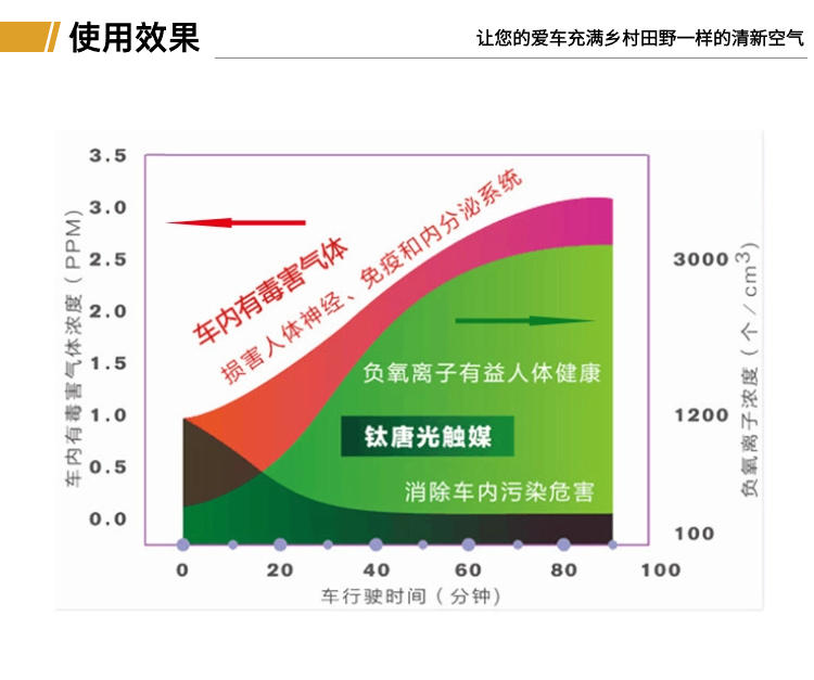 钛唐车用光触媒具有优异的车内光活性,高效持久除车内异味与甲醛;释放负氧离子,让您在行车时也能享受乡间田野一样的清新空气,有利行车安全;杀灭病菌,预防致病细菌传染。另外,光触媒形成的纳米膜吸收紫外线,因此对车内皮革与饰物具有一定的保护作用。