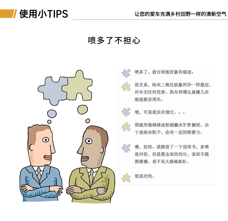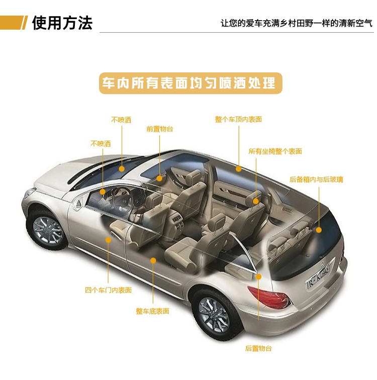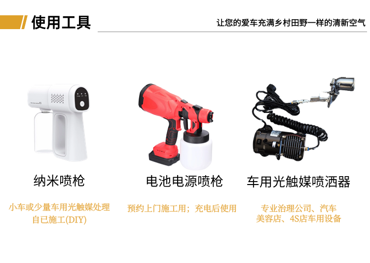 使用方法:用喷嘴小于0.3毫米光触媒喷洒器喷洒于车内物体表面,如不小心在同一处过量喷洒形成较大液滴,用软布或纸巾抹去即可。挡风玻璃与仪表盘玻璃表面可以不喷。每台车用量250-500毫升。