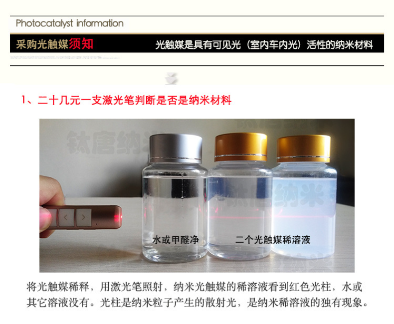 2、成分:锐钛矿型纳米二氧化钛晶体胶体,微量贵金属