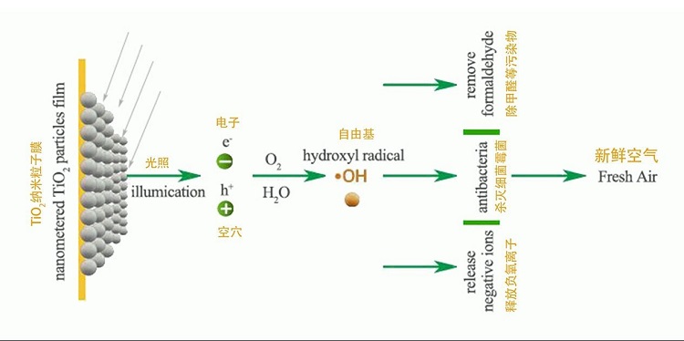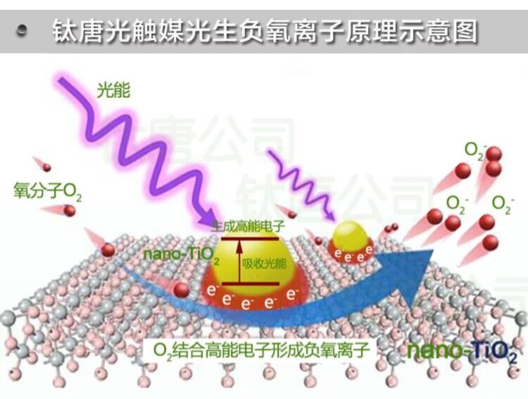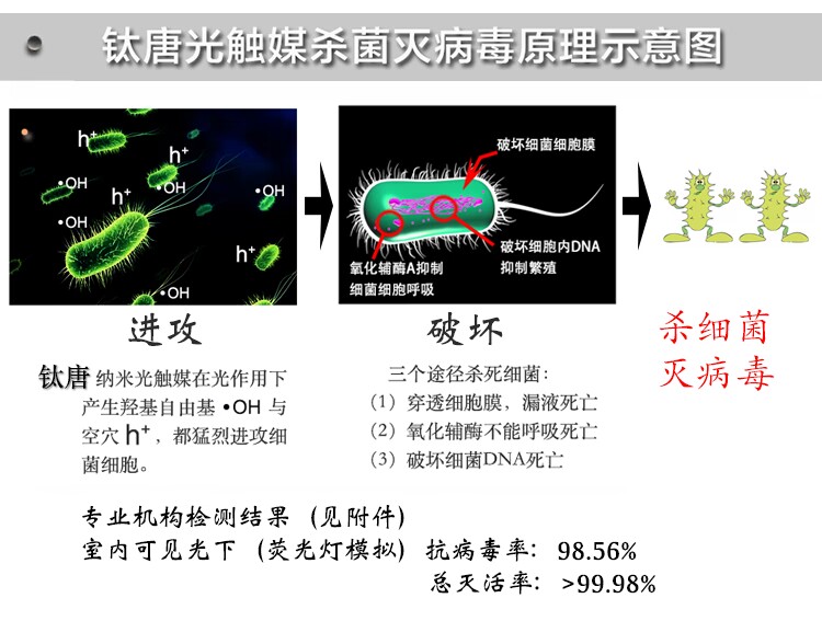 钛唐家用光触媒是一种纳米级二氧化钛光活性材料,喷涂于物体表面,自然干燥形成看不见的纳米膜。在室内光作用下,有效降解有毒害气体(如甲醛、苯、VOCs等);杀灭多种细菌(抗菌率高达99%),抑制疾病传播;同时不断释放“长寿素”负氧离子,有益于人体健康,有效期十年以上。