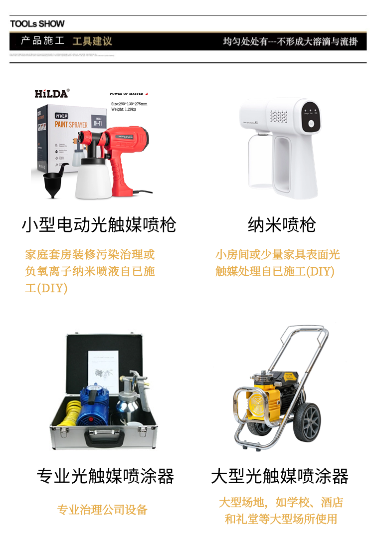 使用方法与使用量:专用光触媒喷洒器喷洒。每公斤实际使用面积80-100平方米,约相当于住房面积30平方米。