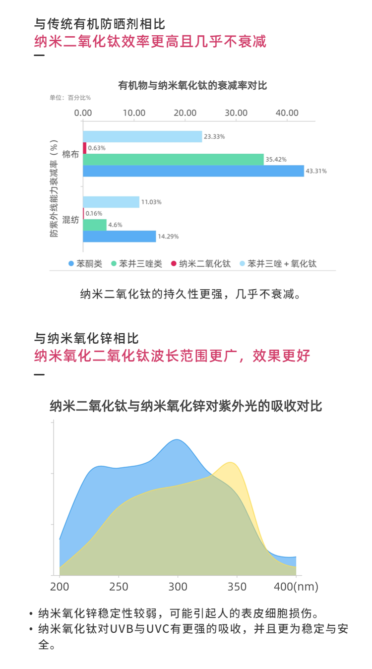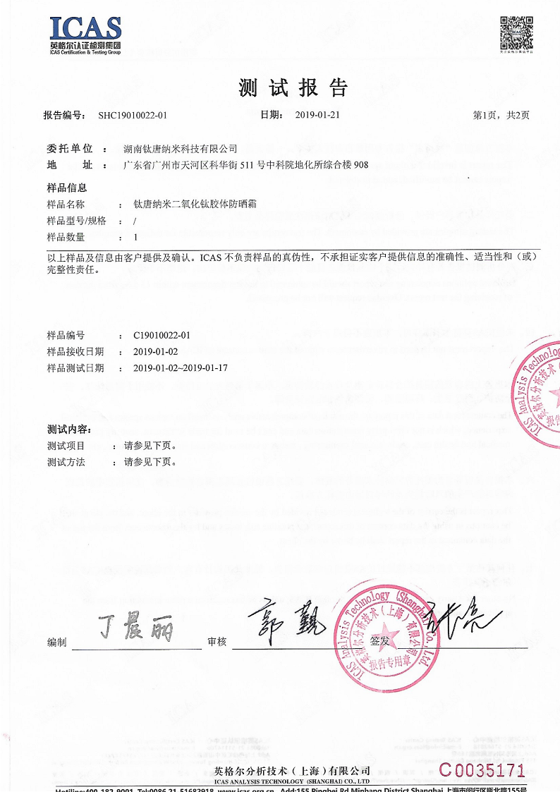 钛唐防晒化妆品专用添加剂是一种高效广谱的防紫外线纳米无机材料添加剂,同时具有抗菌消炎效果。一次粒径5 nm,二次粒径100%分布30-50 nm(粉体浆3-5%左右),化学性质稳定,无刺激,无致敏,与基料相容性好,全面吸收屏蔽紫外线,效能持久不衰减等,是一种安全、稳定、长效的多功能化妆品助剂。