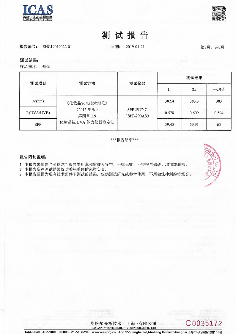 产品无细菌与重金属污染,防晒功能优异,SPF值最高可达65,可以满足最优异防晒化妆品配制,并可赋于产品抗菌消炎功能。