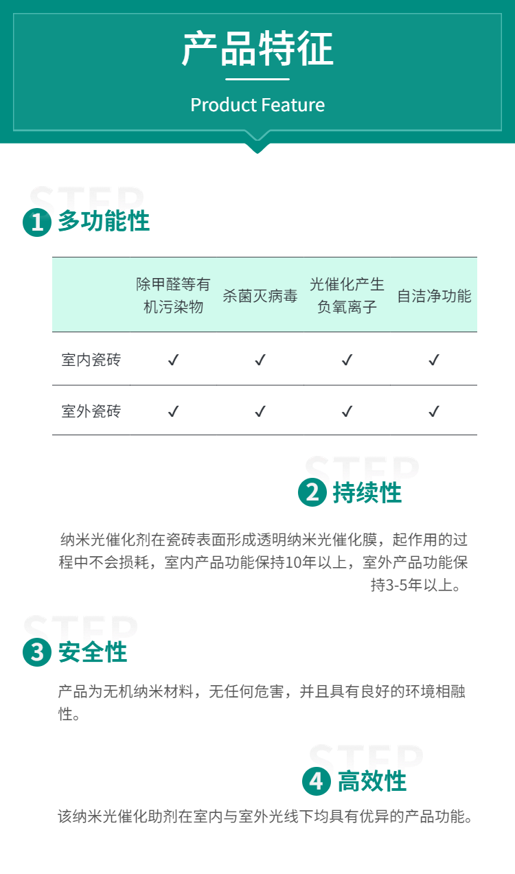 使用方法:推荐利用陶瓷表面抛光设备使用该产品,经喷雾抛光后表面形成透明纳米光触媒功能膜。