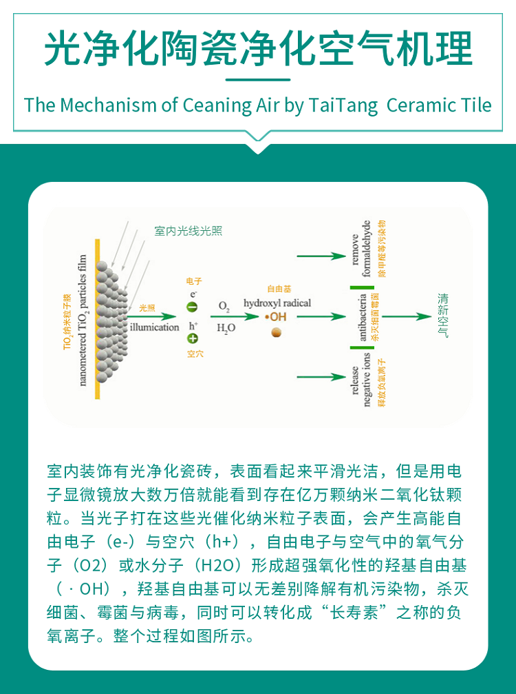 光净化瓷砖纳米催化剂可以赋予陶瓷可见光光触媒功能,在室内光线下净化甲醛等有害污染物,抗菌灭病毒。