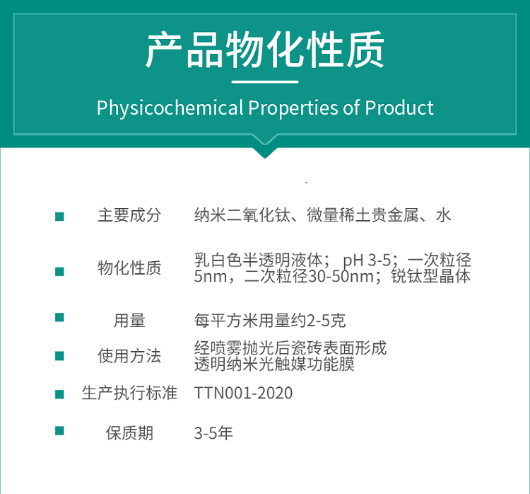 物化性质:乳白色液体; pH=5-6;纳米粒子一次粒径5nm,二次粒径30-50nm;锐钛型晶体。