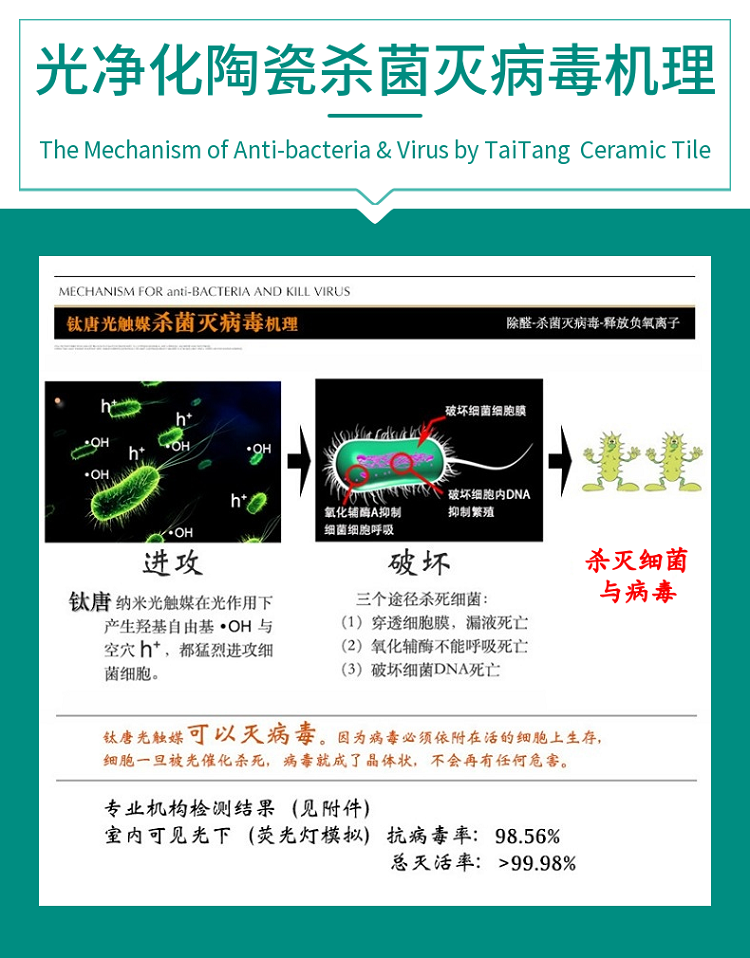 光净化瓷砖纳米催化剂可以赋予陶瓷可见光光触媒功能,在室内光线下净化甲醛等有害污染物,抗菌灭病毒。
